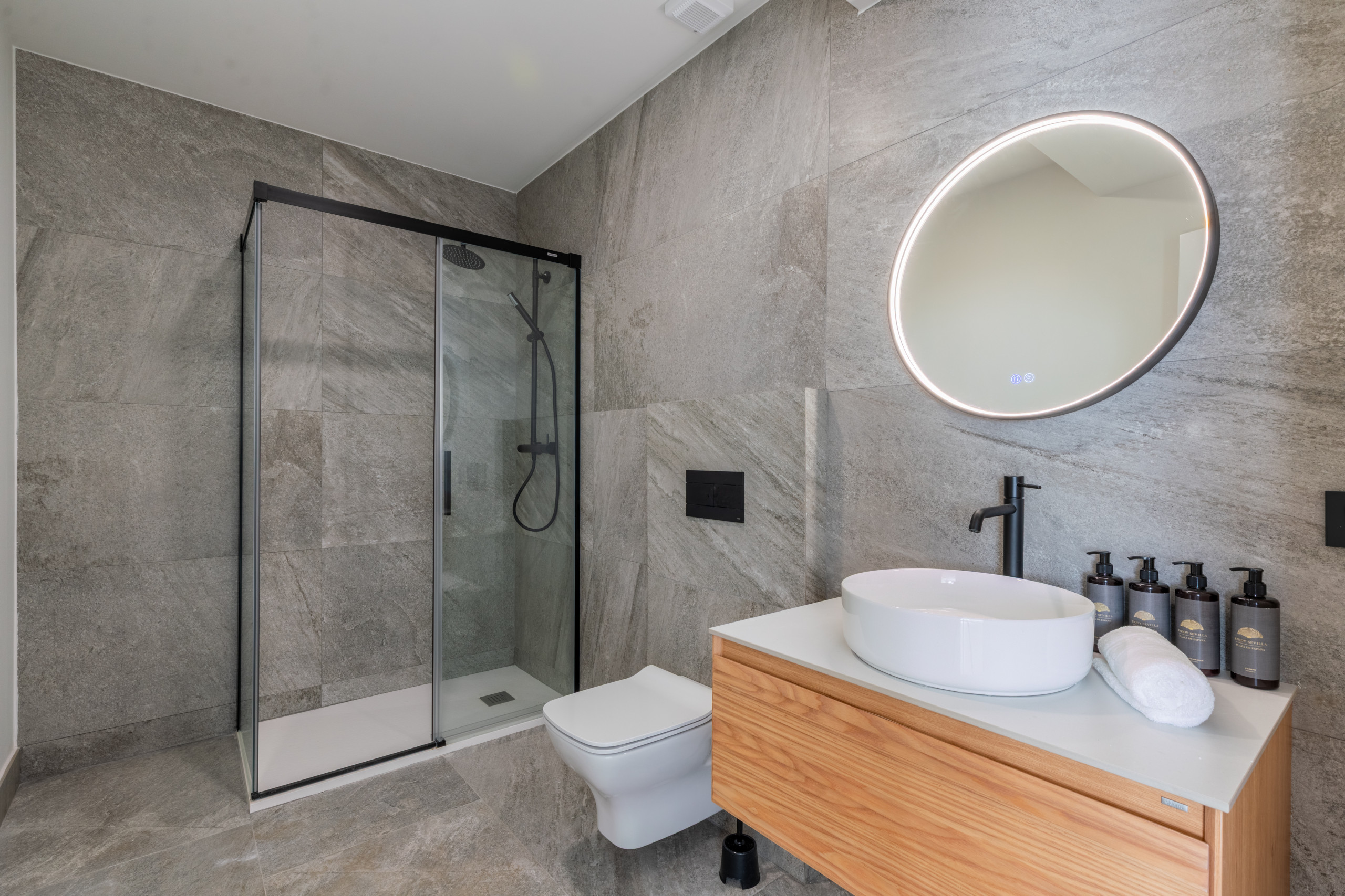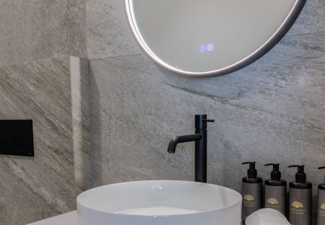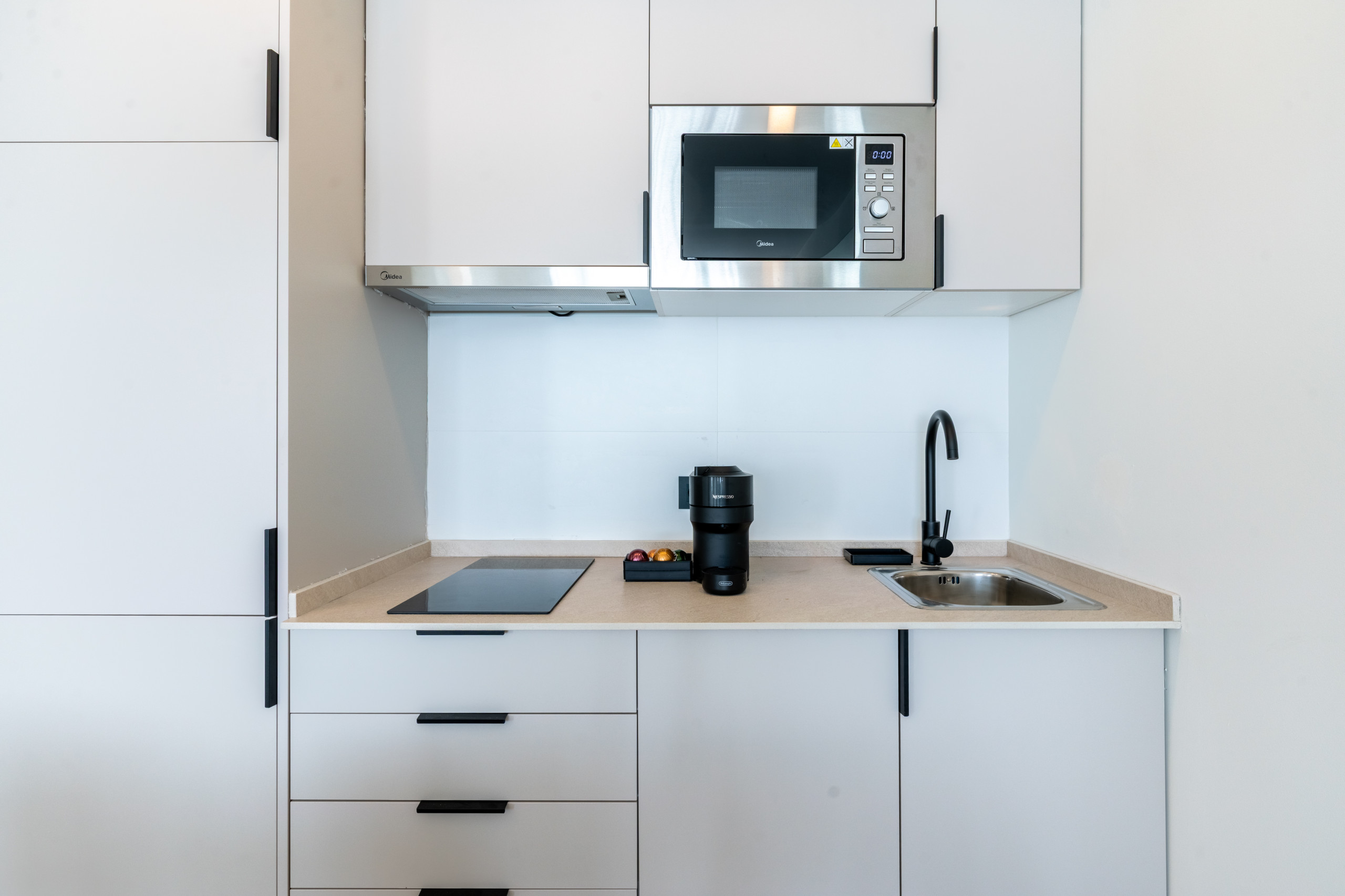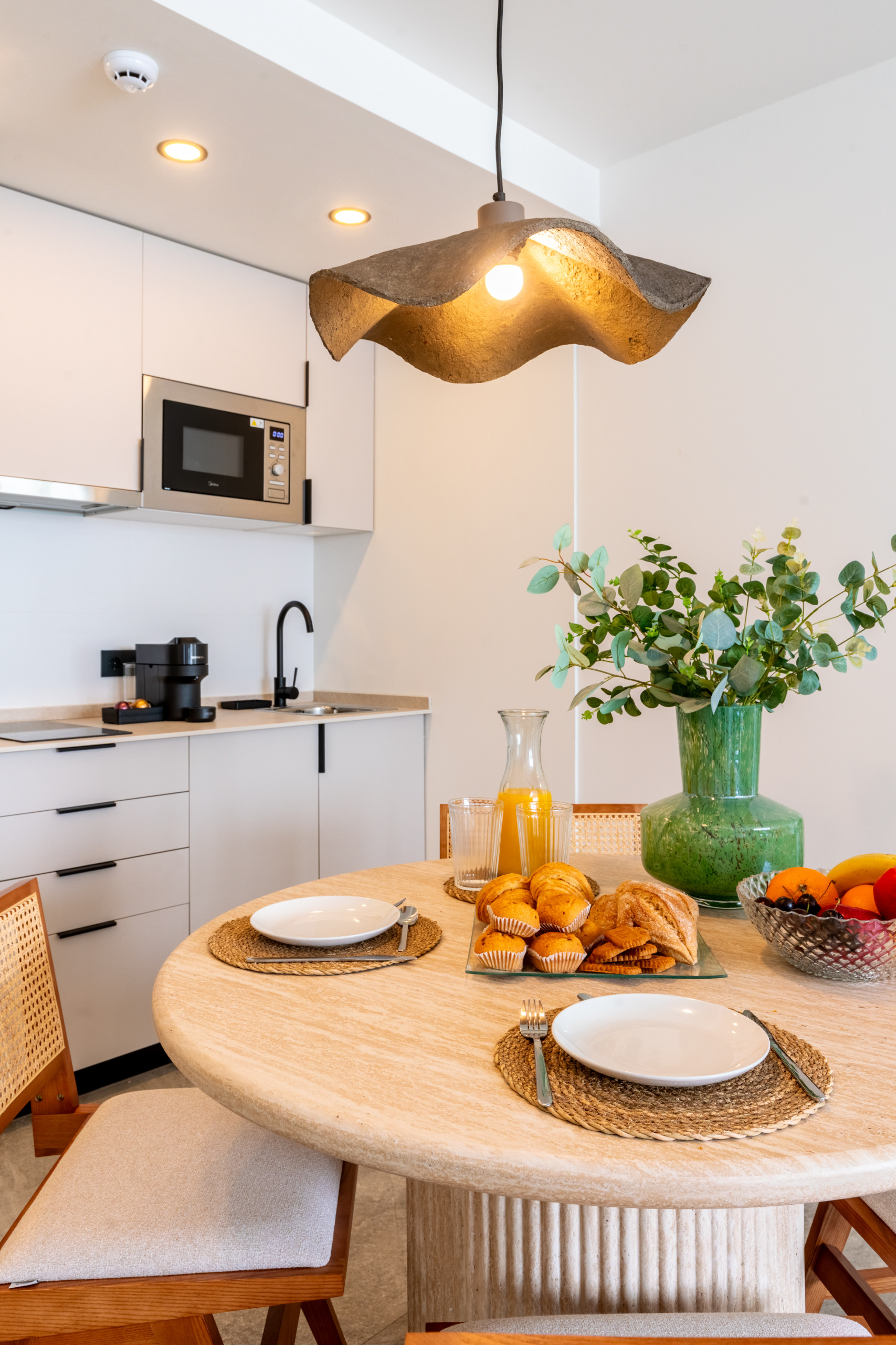 The open-plan induction kitchen is fully equipped with refrigerator, microwave, freezer, dishwasher, dishes and cutlery, kitchen utensils, coffee machine, toaster, kettle, and juicer, providing everything needed to cook and feel at home during your stay.